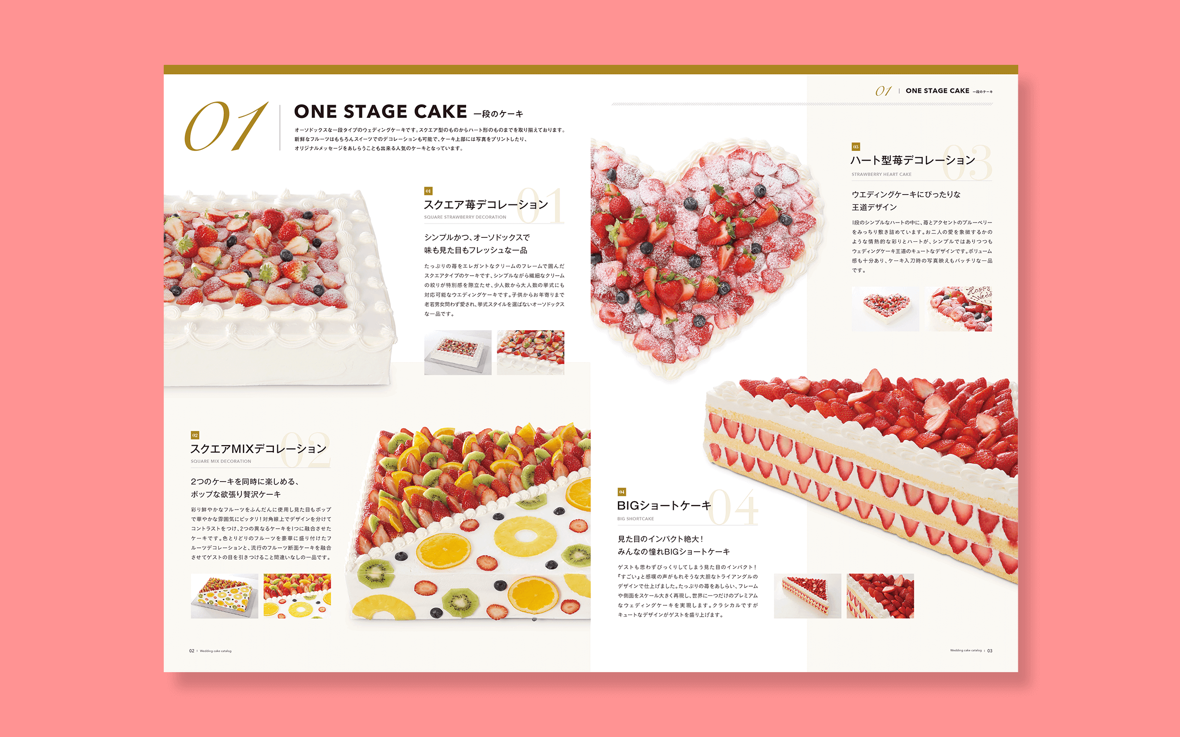ケーキは華やかな見た目を引き立たせるように全てメインの写真は切り抜きで作成、細かなディティールにもこだわって作られているケーキや、みずみずしいフルーツを魅せるためのサムネイルも追加し、各ケーキのこだわりを記載したテキストを添えて見て楽しめるようなケーキカタログとしました。