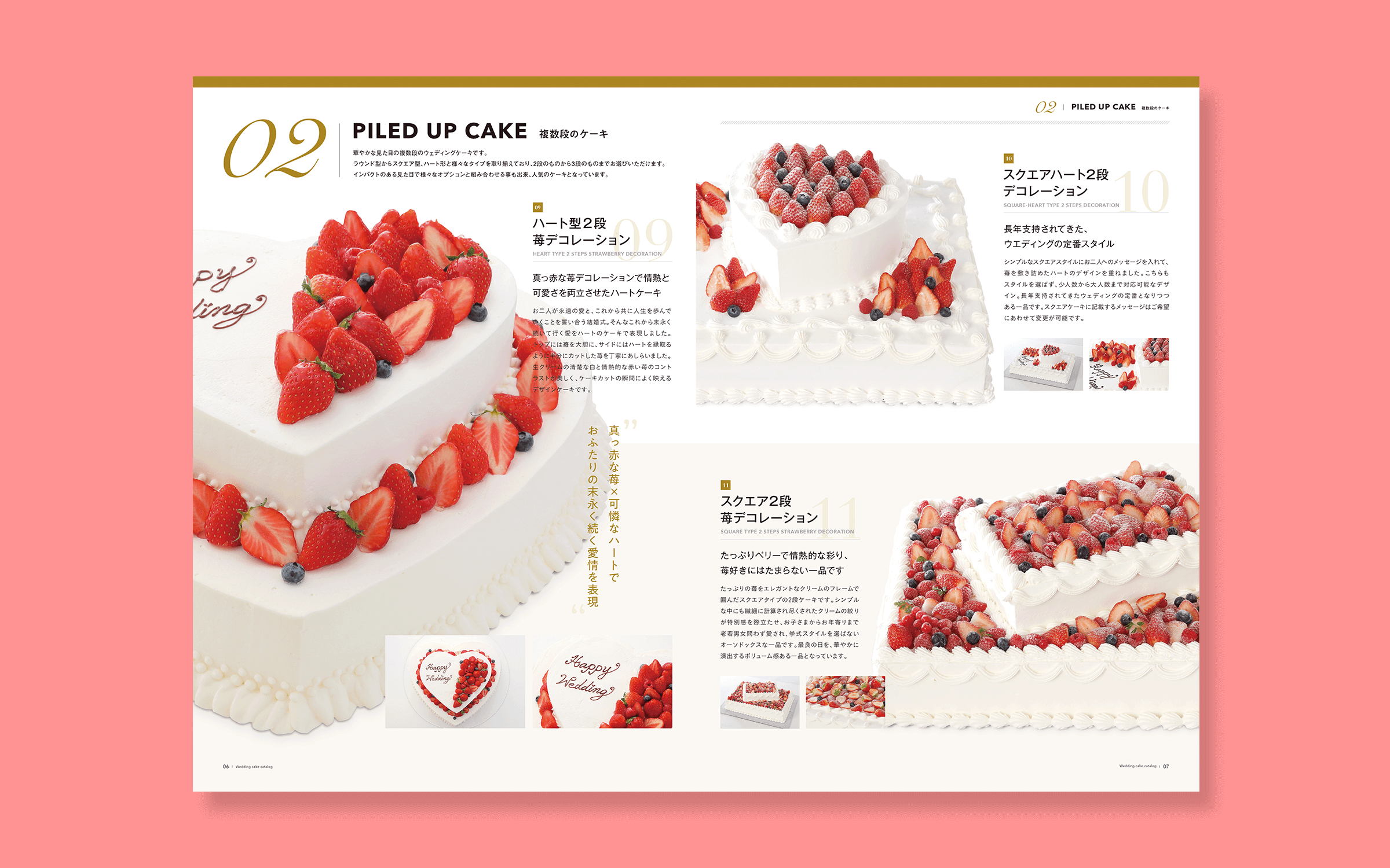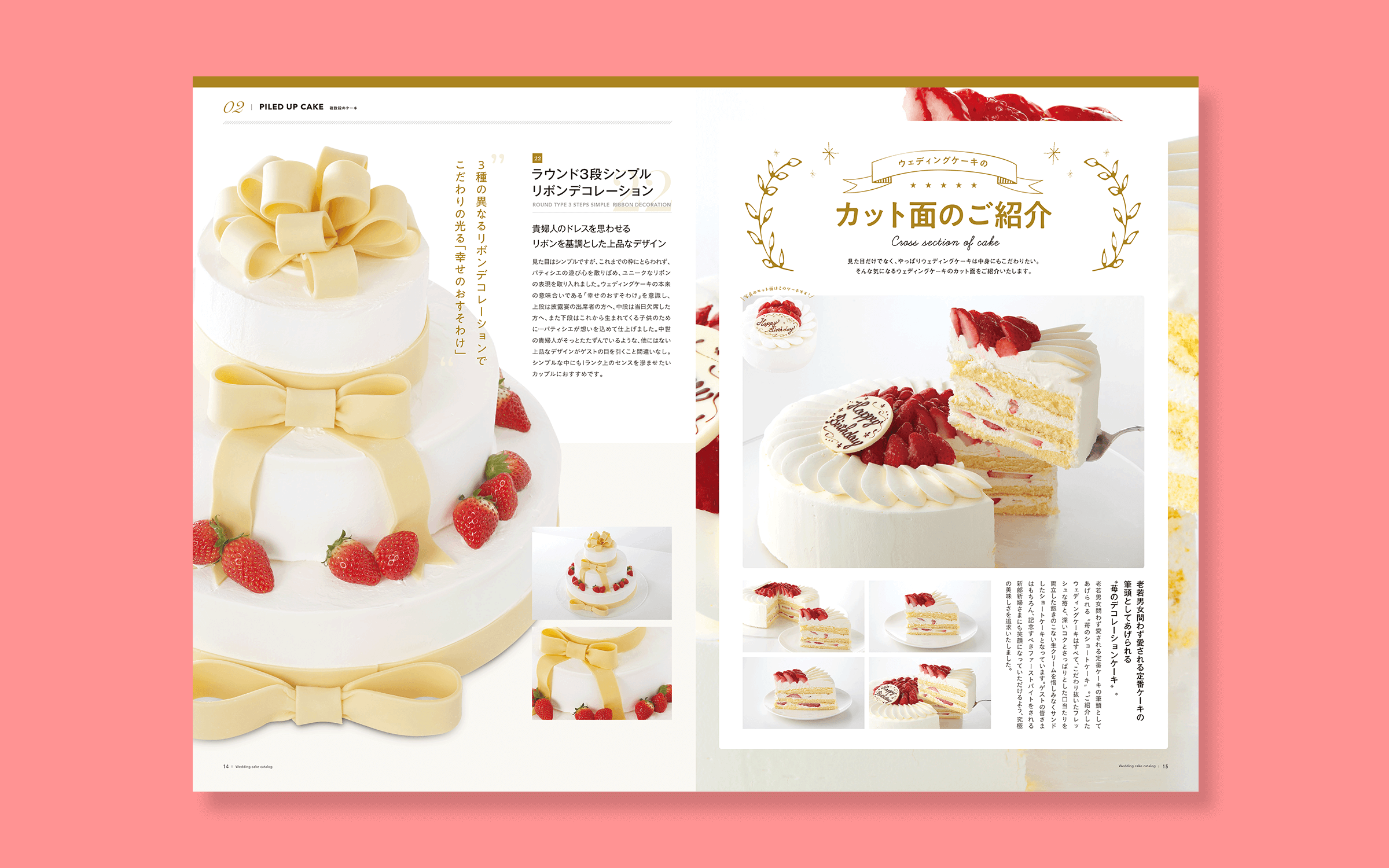 様々なケーキをオンラインで注文できるCake.jp様のウェディングケーキカタログのデザインを担当しました。結婚式の打ち合わせの際に用いられるケーキを一覧できるカタログのデザインです。