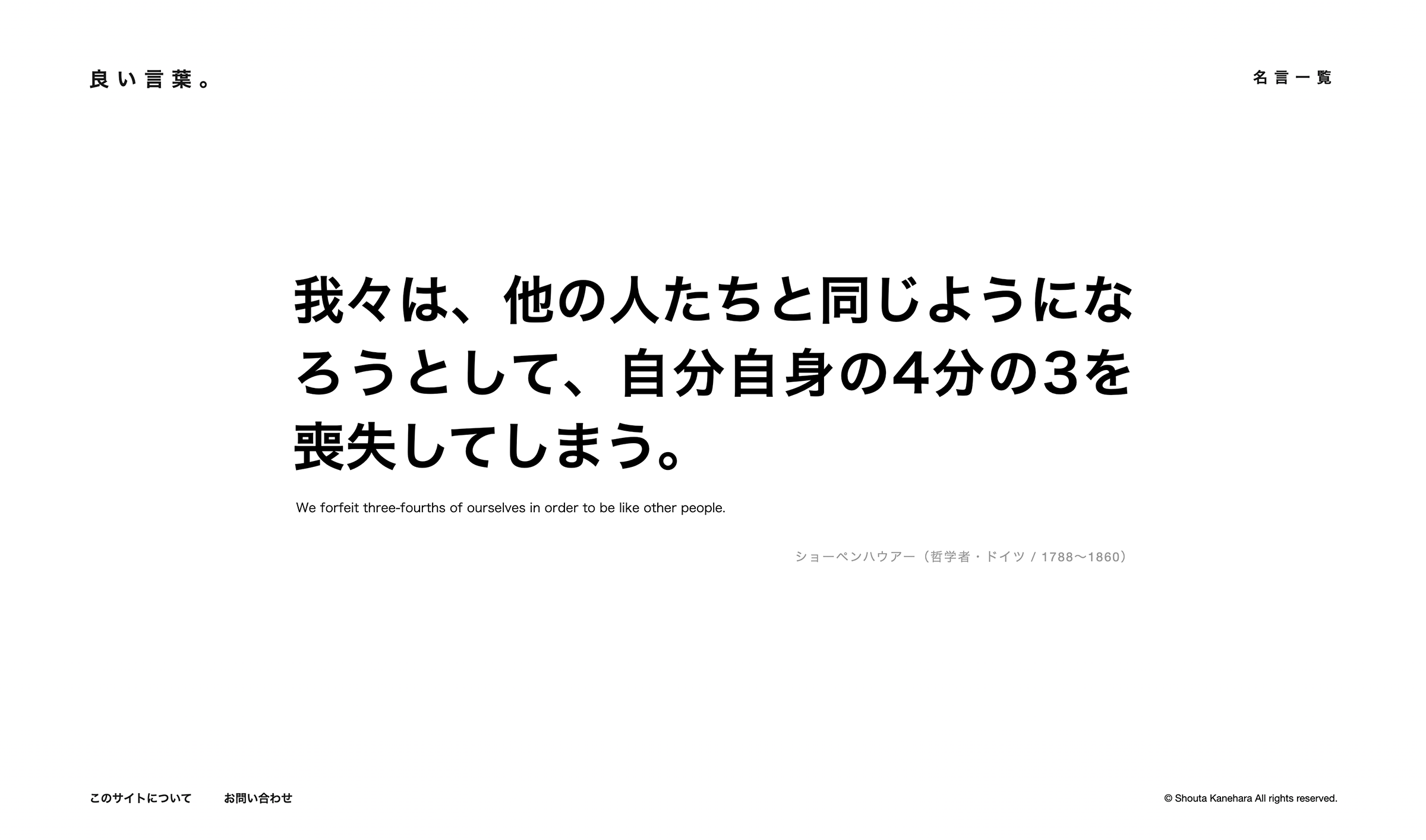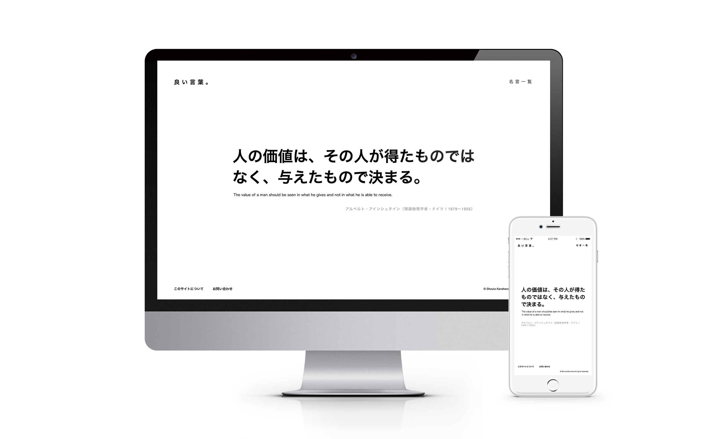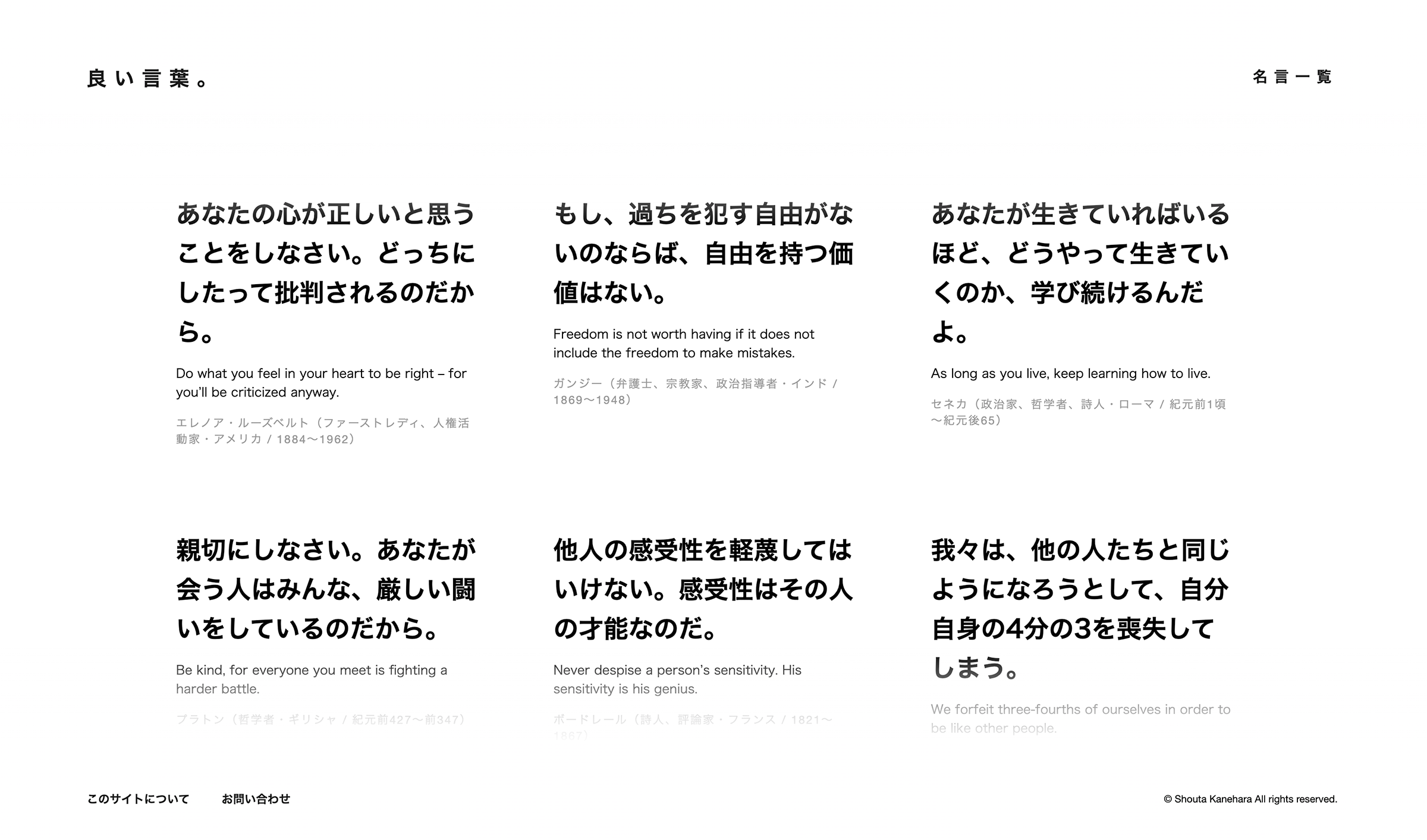個人制作のWebサイトです。個人的に心に残った名言を一覧し、好きな時に眺める為に制作したサイトです。